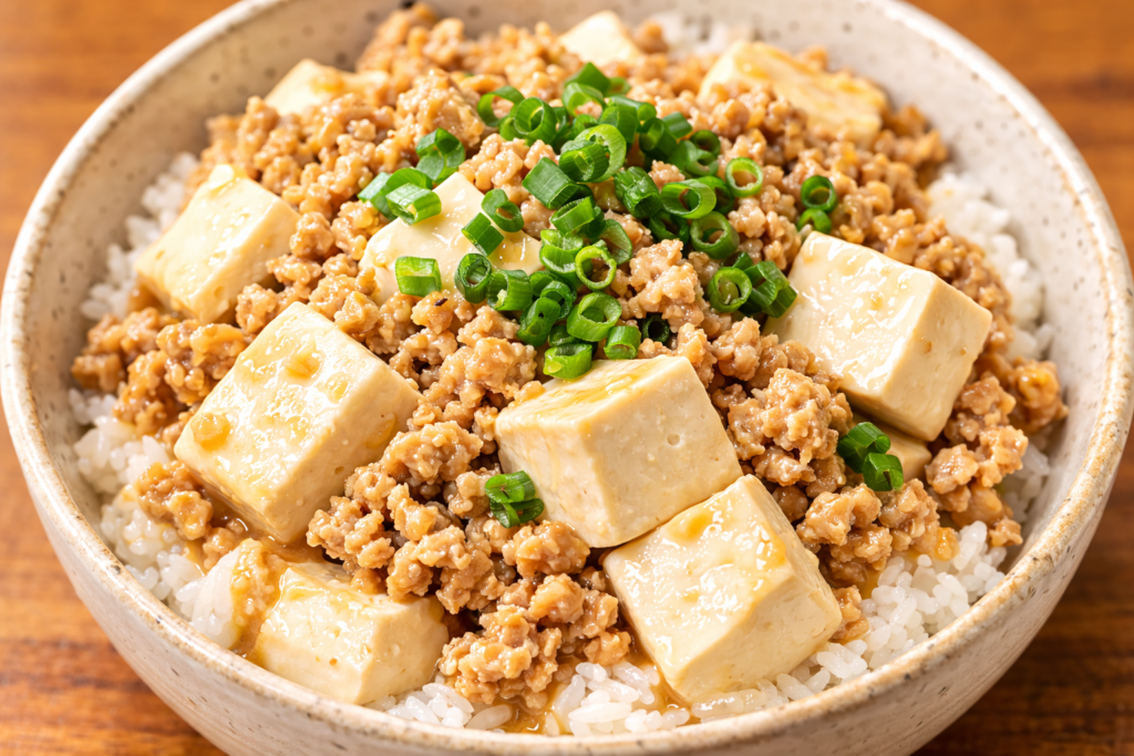 鶏ひき肉のうまみと豆腐のやさしい食感がよく合う、食べやすい丼です。